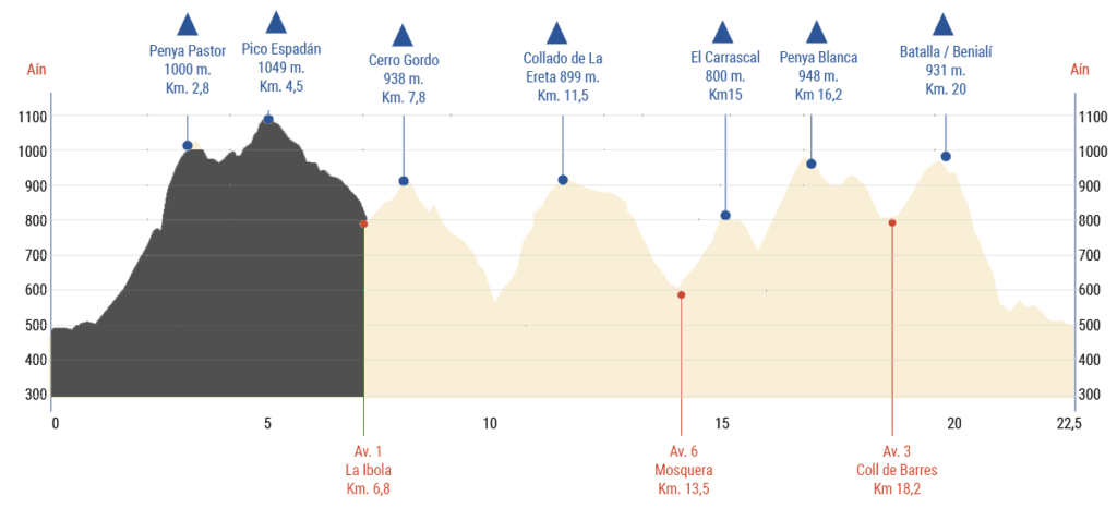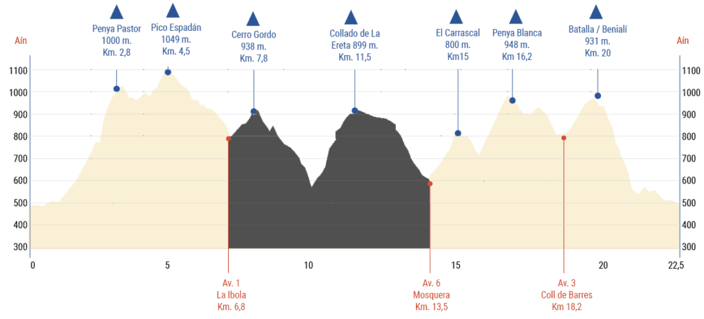 El recorrido se inicia con un bucle por dentro del bonito pueblo de Aín, para estirar el grueso de corredores. Tras salir de Aín y cruzar la CV200, comienza una subida muy lenta en una de las zonas más bonitas de la carrera, que nos llevará por la senda del Canyaret hacia la Penya Pastor y la Finestra. Primera parte de gran pendiente que cruza varias pedreras y que finaliza en una trepada sin exposición. Le sigue una zona de cresteo con vegetación de alto valor ecológico hasta el Pico Espadán. La última parte de este tramo es una bajada con un inicio muy técnico que en poco más de 2km lleva hasta el avituallamiento en el Coll de La Íbola.