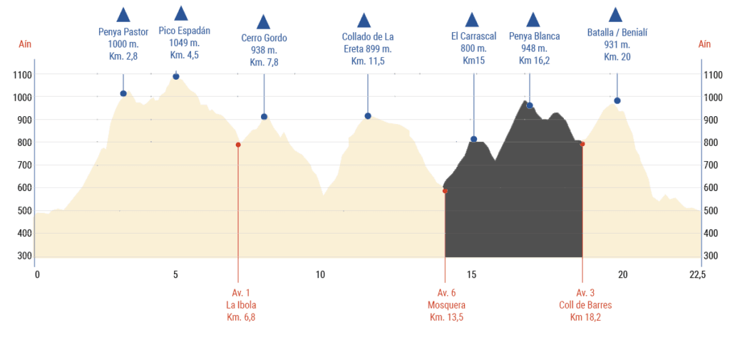 Desde La Casa Mosquera, transitamos unos 300 por pista hasta encontrar un sendero en zig zag con moderada pendiente que lleva a una zona de cresteo corto, con vistas al rocoso Carrascal. Luego bajamos a un collado donde empieza la durísima subida a Penya Blanca, con pendientes que llegan a alcanzar el 70% y mucha piedra rota. Una vez lleguemos al pico, comienza una zona de cresteo suave, muy visual, hasta alcanzar una senda hacia la izquierda, por el que realizar un descenso muy corredor hasta el avituallamiento del Coll de Barres